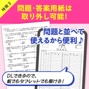 これまで蓄積したノウハウとデータで頻出論点を徹底分析! よく出る論点の解き方を一気に解説するので、集中が途切れることなく学習できます! 特に重要な箇所は色付きで一目瞭然なので、復習の時もカンタンにおさらい! | 本書で解説した問題は「ホントによく当たる!」ので、直前期の方は特に必見です! わかりやすく丁寧な解説つきで、試験直前の勉強もバッチリ。 | 問題用紙は取り外しができ、答案用紙は取り外しもダウンロードもできる! 問題と並べて、試験本番さながらの演習ができるので、本試験の対策はバッチリ! 答案用紙のダウンロードは無料なので、紙でもタブレットでもお好きな学習方法を選べます! |