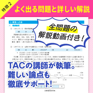 よく出る問題の論点を押さえて万全の直前対策を! | TACの講師陣が執筆したわかりやすい解説で、合格までを徹底サポート! | 問題用紙と答案用紙は取り外しが可能!答案用紙はダウンロードできるので、お好きな学習スタイルを実現できます! | ||