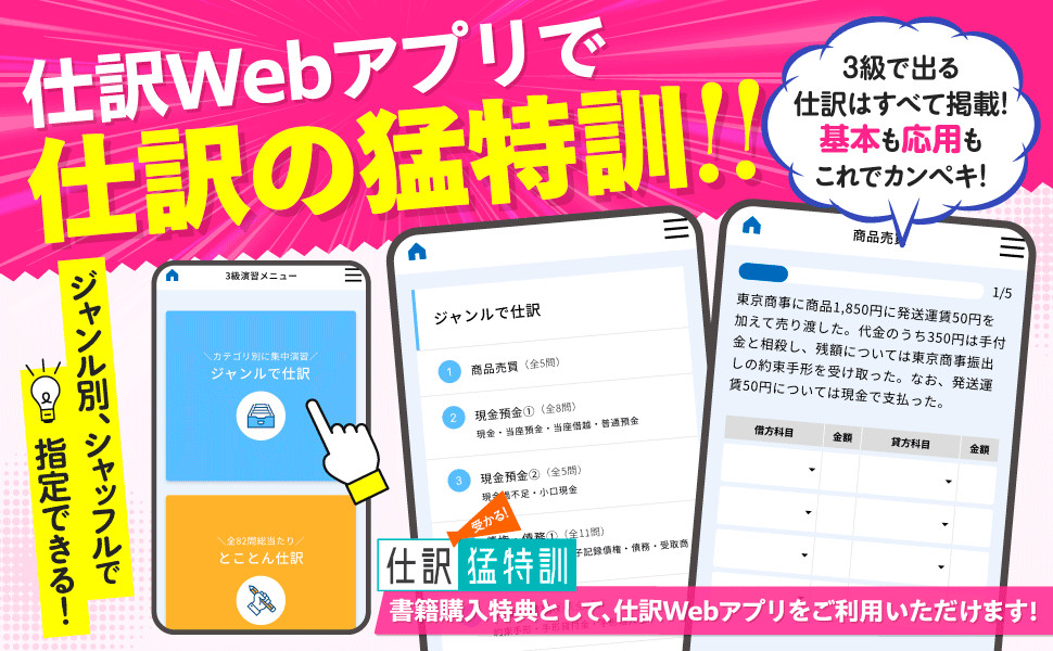仕訳Webアプリ「受かる!仕訳猛特訓」は書籍購入特典として無料で利用可能!