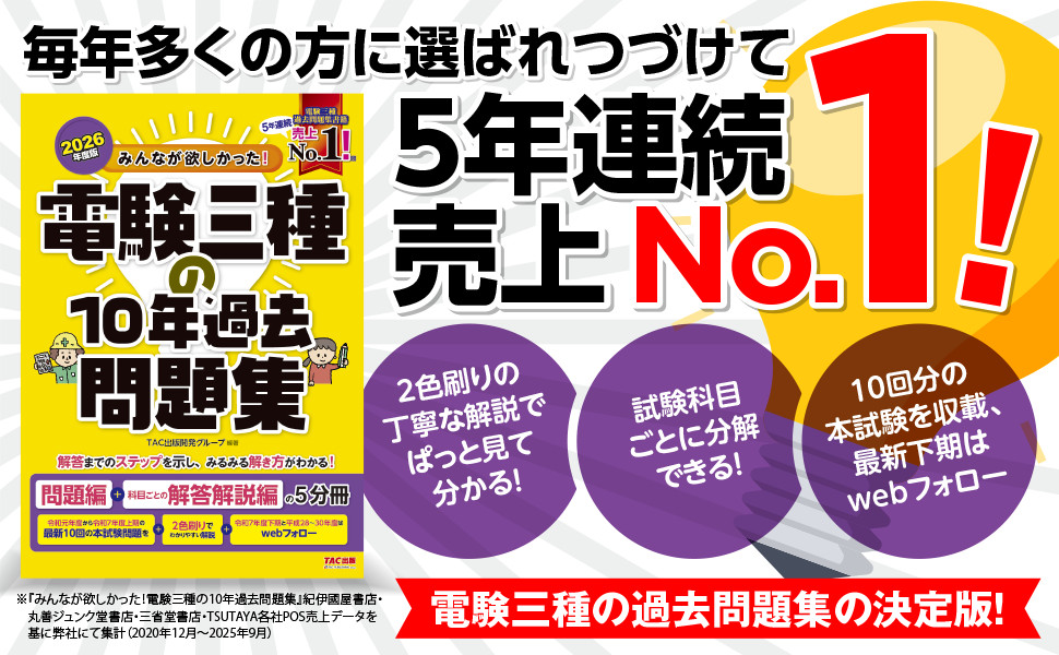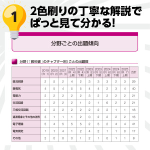 2色刷りで丁寧な解説です。また、分野ごとの出題傾向もばっちりわかります。2色刷りで丁寧な解説です。また、分野ごとの出題傾向もばっちりわかります。 | 「電験の過去問題集はどれも分厚くて持ち運びできない!」という受験生の声に応えて、試験科目ごとの分冊形式にしました。 | 本書では10回分の問題を収載。令和7年度下期および平成28・29・30年度については、webフォローを実施!過去問演習で試験対策はバッチリ! |