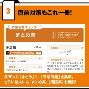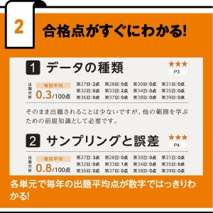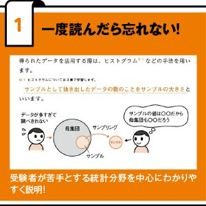 受験者が苦手とする統計分野を中心にわかりやすく説明! 単元をまたいで出てくる内容も適宜解説しているため、効率的に勉強できます。 | 各単元で毎年の出題平均点が数字ではっきりわかる! あと何点あれば合格点に届くのかすぐにわかるので、モチベーションもアップします。 | 各章末に「まとめ」と、過去に出題された問題を徹底分析して作成した「予想問題」を掲載。さらに巻末に「まとめ集」も新設! 直前期はこれを繰り返すだけで大丈夫なので、時間がない社会人でも確実に力が身につきます。 |