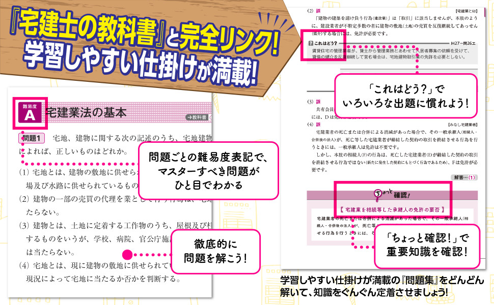 姉妹書『宅建士の教科書』との繰り返し学習で、「学んだ知識」を「使える知識」へと発展させましょう。