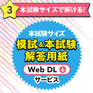 模試に取り組んだ結果をWeb上で入力すると、ユーザー中の順位などがわかります。 | 解説の最初に結論、その後詳しい解説を掲載しているため、重要ポイントがまるわかりです。 | Webダウンロードサービスでご提供する「本試験サイズ模試&本試験」「本物そっくり解答用紙」を利用すれば、より臨場感を体験しながら学習することも可能です。 |