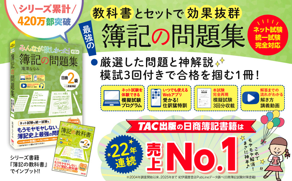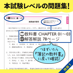 近年頻出の新形式問題にもしっかり対応できる問題を掲載!「知ってるのに解けない!」という新形式の問題にありがちな悩みを一気に解消! | 論点ごとに身につけた知識を1つにまとめる、模擬試験問題がなんと3回分!時間を図って本試験感覚をつかみましょう!『簿記の問題集2級 工業簿記』(別売)にも3回分の模試があるので、揃えれば6回分の演習が可能に! | 独学ではなかなかわからない、問題の解き方・考え方を詳しく説明。混乱しがちな知識もポイントでしっかり整理。細かい仕訳処理まで丁寧に解説! |