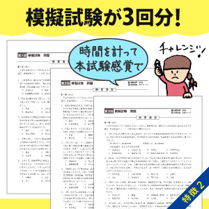 本試験を徹底的に分析した良問を厳選! | 本試験レベルの、模擬試験が3回分! | 独学者用に解き方・考え方を解説! | ||