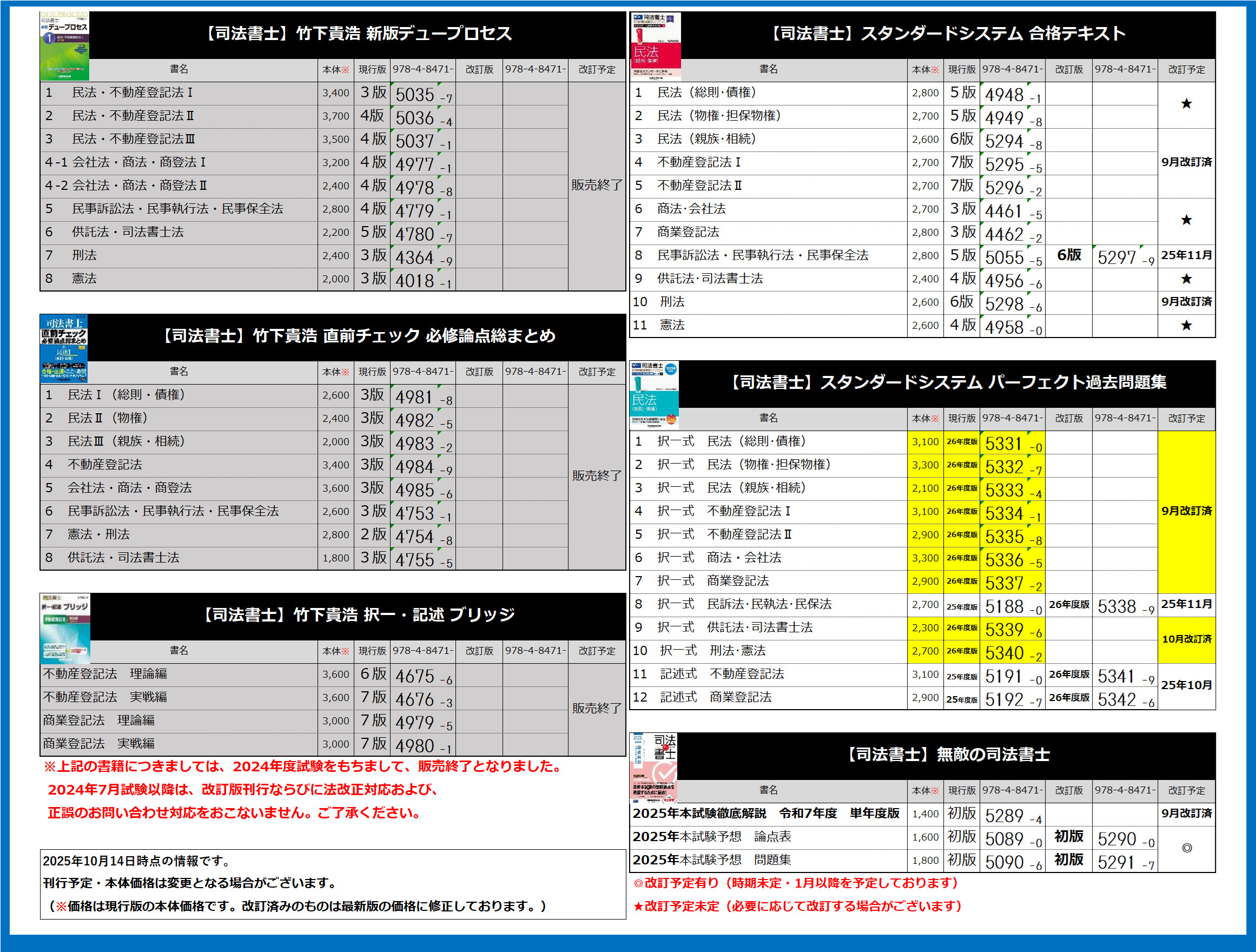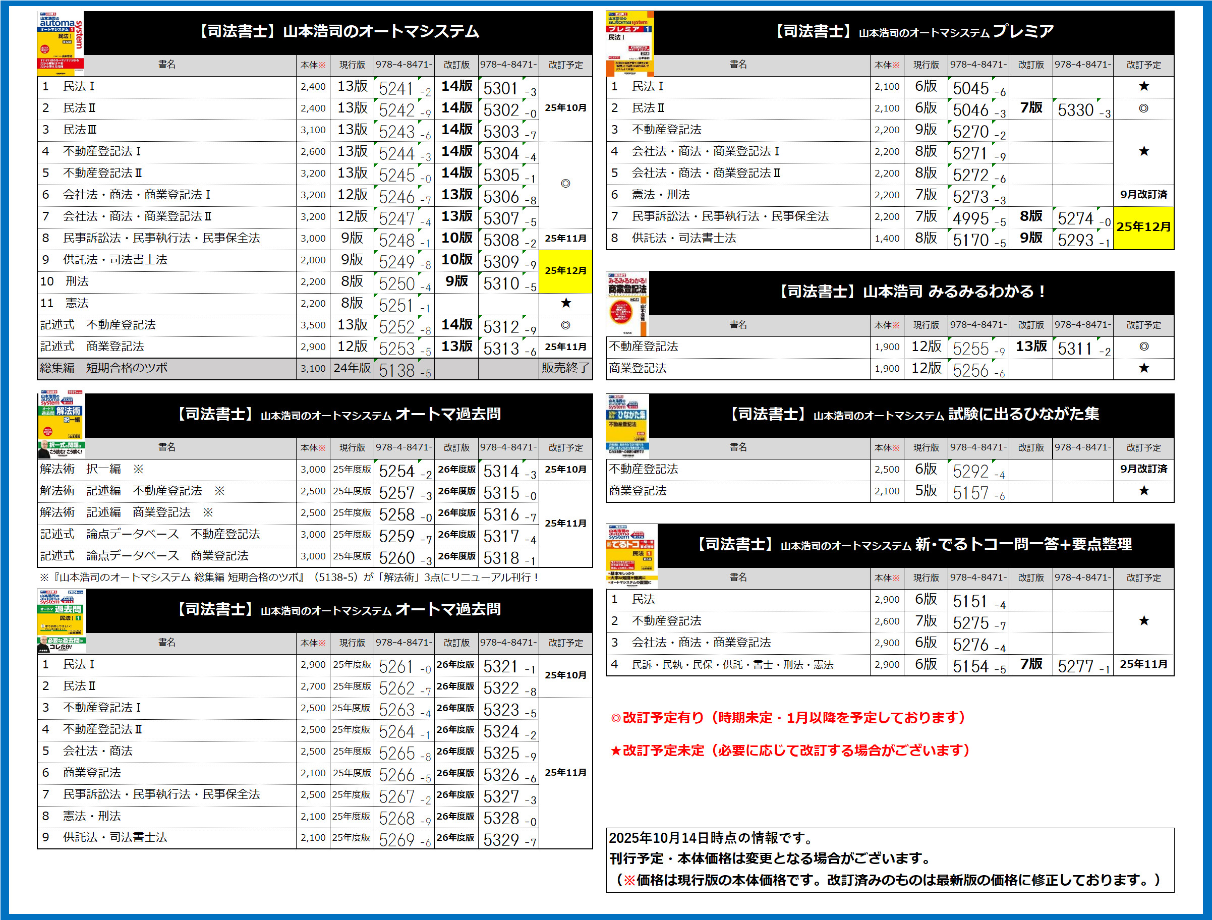 司法書士関連書籍の刊行予定に関するお知らせ(10月14日時点)