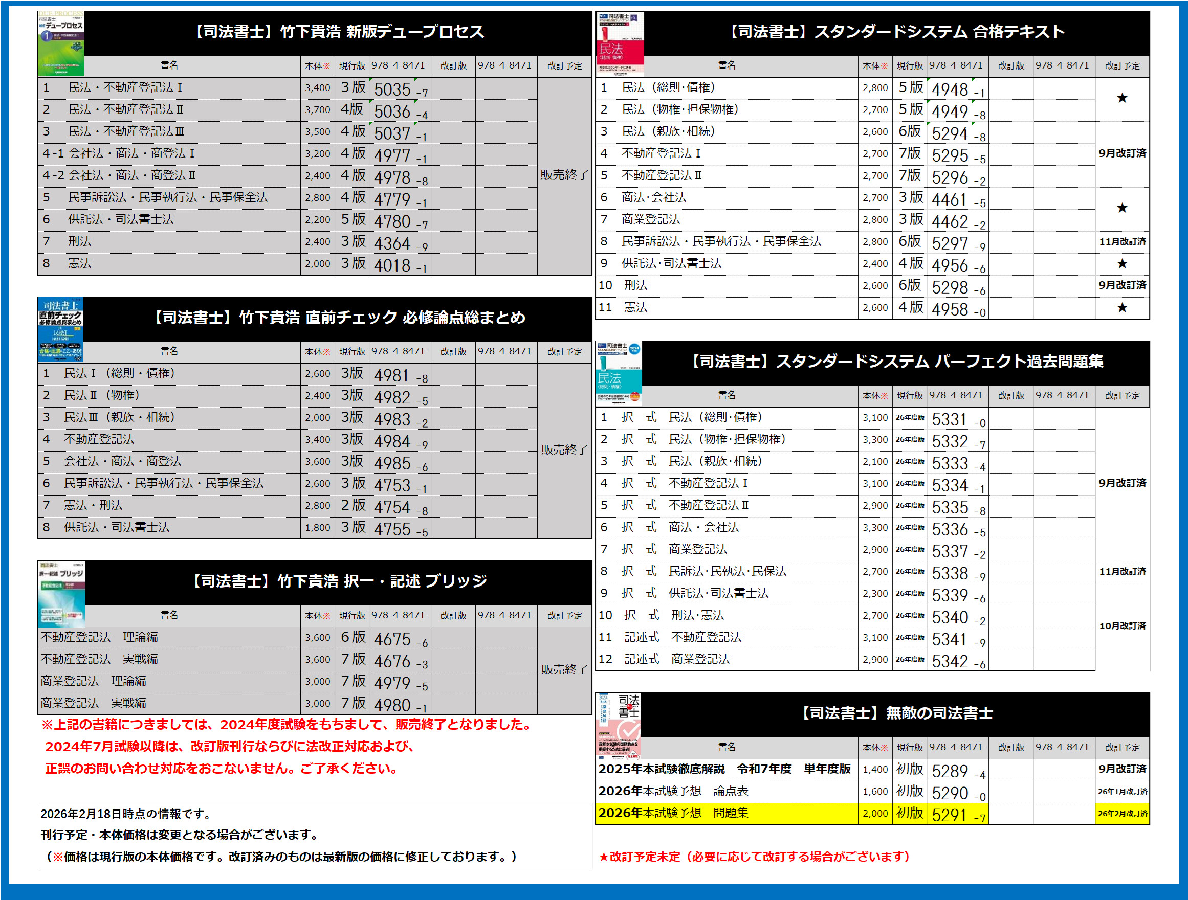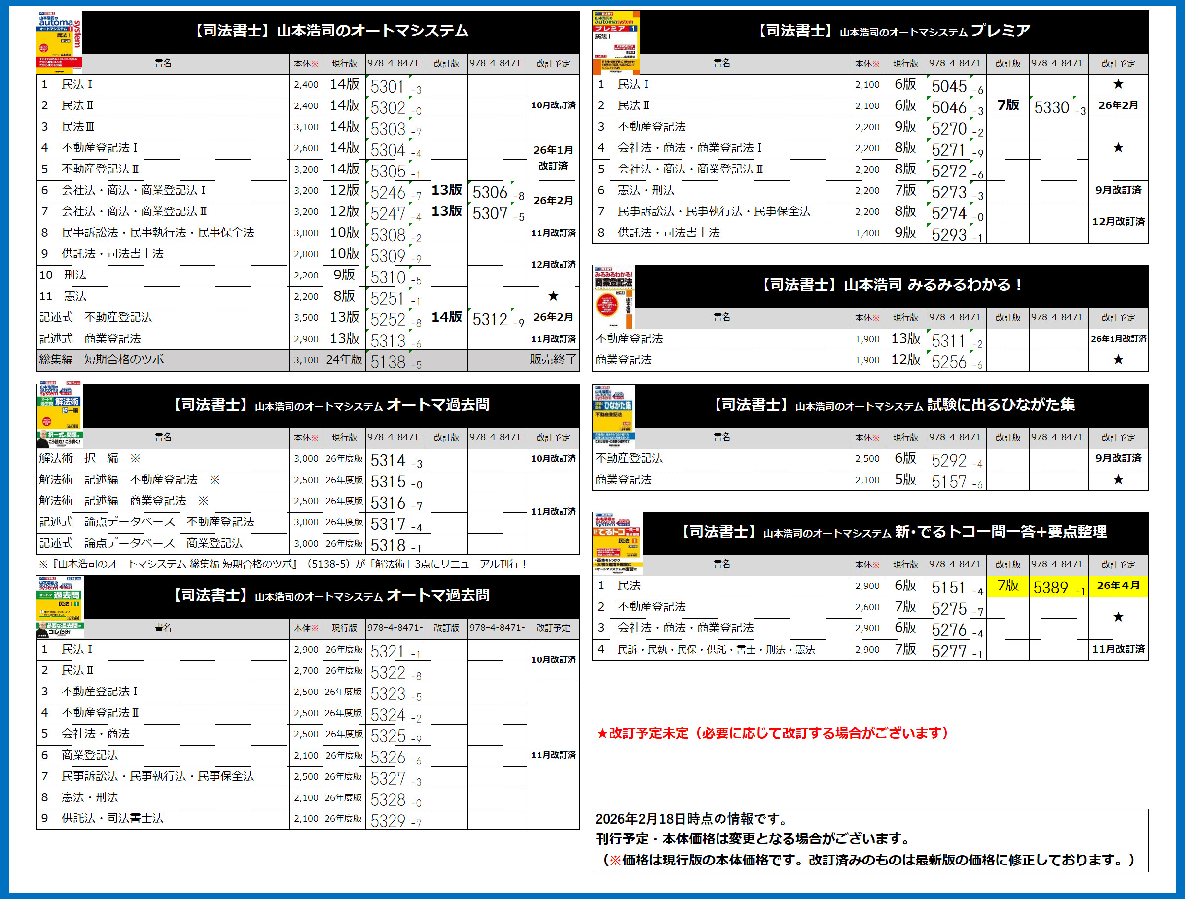 司法書士関連書籍の刊行予定に関するお知らせ(2月18日時点)
